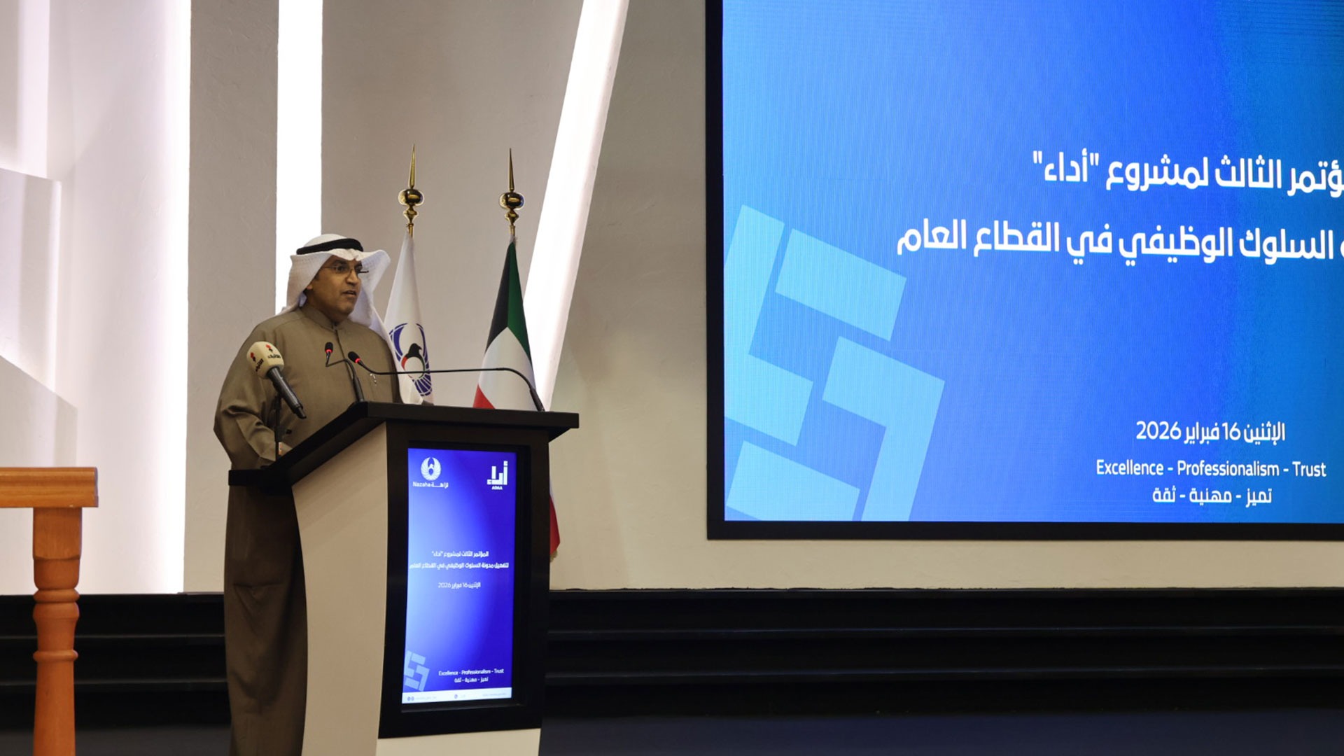 Kuwait Direct Investment Promotion Authority (KDIPA) participated among other governmental entities in the Third “ADA’A” project conference of functional excellence for public sector organizations, organized by the Kuwait anti-corruption Authority (Nazaha), which is designed to promote the principles of integrity and transparency through adherence to the rules of professional conduct for employees, on Monday February 16, 2026.